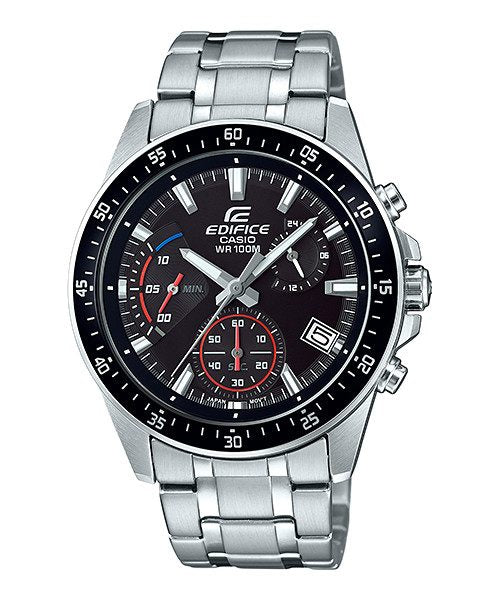 Standardni EDIFICE hronograf srednje veličine. Delovi brojčanika su završeni crvenom i plavom akcentom kako bi se stvorio uski, sportski dizajn. Dimenzije modela su 48.5 × 43.8 × 11.6 mm