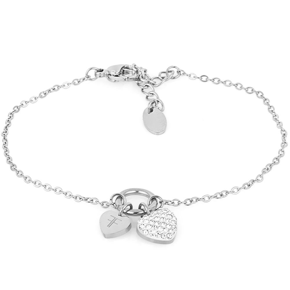 Ženska narukvica Freelook u srebrnoj boji, modernog i elegantnog dizajna sa priveskom u obliku srca ispunjen cirkonima. Izrađena od hiruškog čelika.
