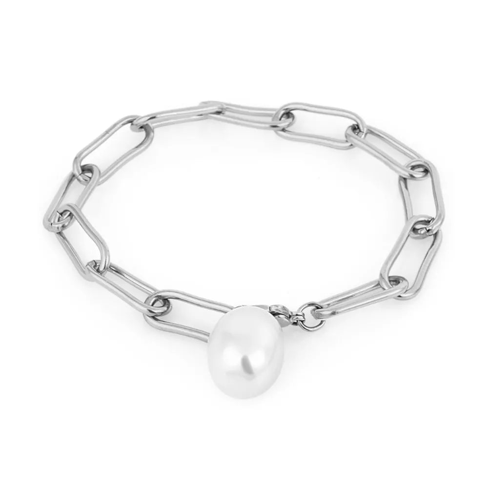 Ženska narukvica Freelook u srebrnoj boji, modernog dizajna sa bisernim priveskom.. Izrađena od hiruškog čelika.