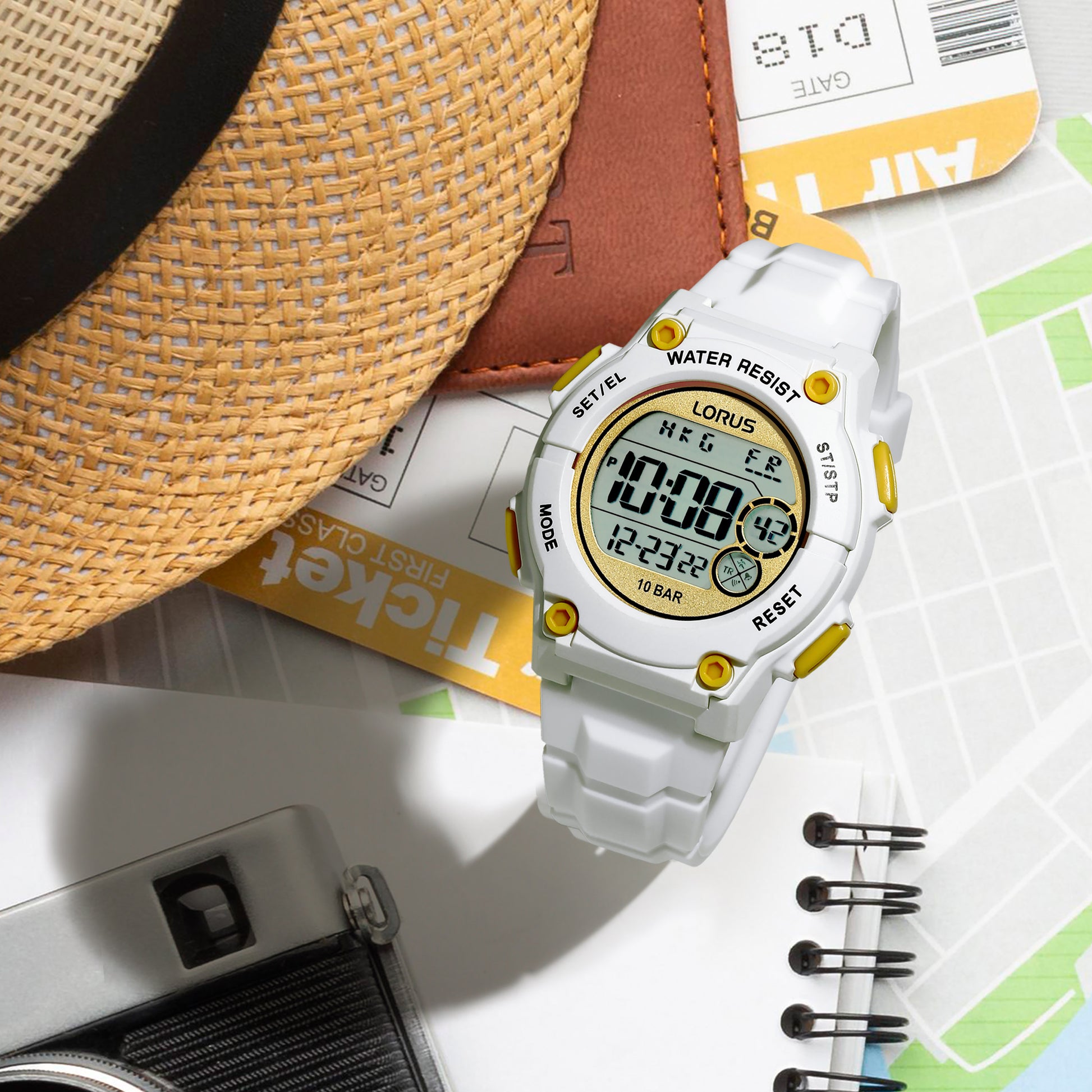 Lorus R2337PX9 je moderan sportski digitalni sat dizajniran za aktivan stil života, sa laganim plastičnim kućištem i udobnom belom silikonskom narukvicom. Nudi sve ključne funkcije koje su potrebne za svakodnevnu upotrebu – hronograf, alarm, odbrojavanje, dual time, kalendar, 12/24h format i osvetljenje displeja. Zahvaljujući vodootpornosti od 100 m, idealan je za plivanje i boravak u vodi, dok kvarcni mehanizam obezbeđuje pouzdan rad. Jednostavan, praktičan i vizuelno svež, ovaj model je odličan izbor za sve koji traže funkcionalan i pristupačan sportski sat.
