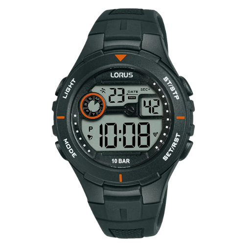 Lorus R2381PX9 je kompaktan i izdržljiv sportski digitalni sat, sa crnom silikonskom narukvicom i laganim kućištem koje ga čini udobnim za svakodnevno nošenje. Nudi ključne funkcije poput hronografa, tajmera, alarma, dual-time prikaza, automatskog kalendara i EL osvetljenja, dok kvarcni mehanizam obezbeđuje pouzdan rad. Vodootpornost od 100 m omogućava bezbrižno korišćenje u vodi, što ovaj model čini odličnim izborom za svakodnevne aktivnosti i sport.