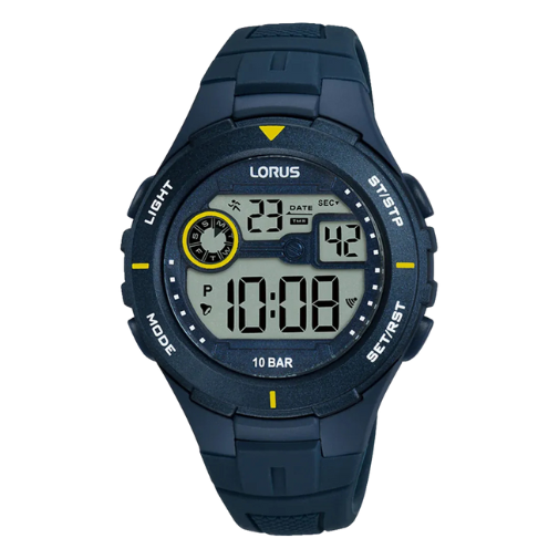Lorus R2383PX9 je kompaktan i izdržljiv sportski digitalni sat, sa plavom silikonskom narukvicom i laganim kućištem koje ga čini udobnim za svakodnevno nošenje. Nudi ključne funkcije poput hronografa, tajmera, alarma, dual-time prikaza, automatskog kalendara i EL osvetljenja, dok kvarcni mehanizam obezbeđuje pouzdan rad. Vodootpornost od 100 m omogućava bezbrižno korišćenje u vodi, što ovaj model čini odličnim izborom za svakodnevne aktivnosti i sport.