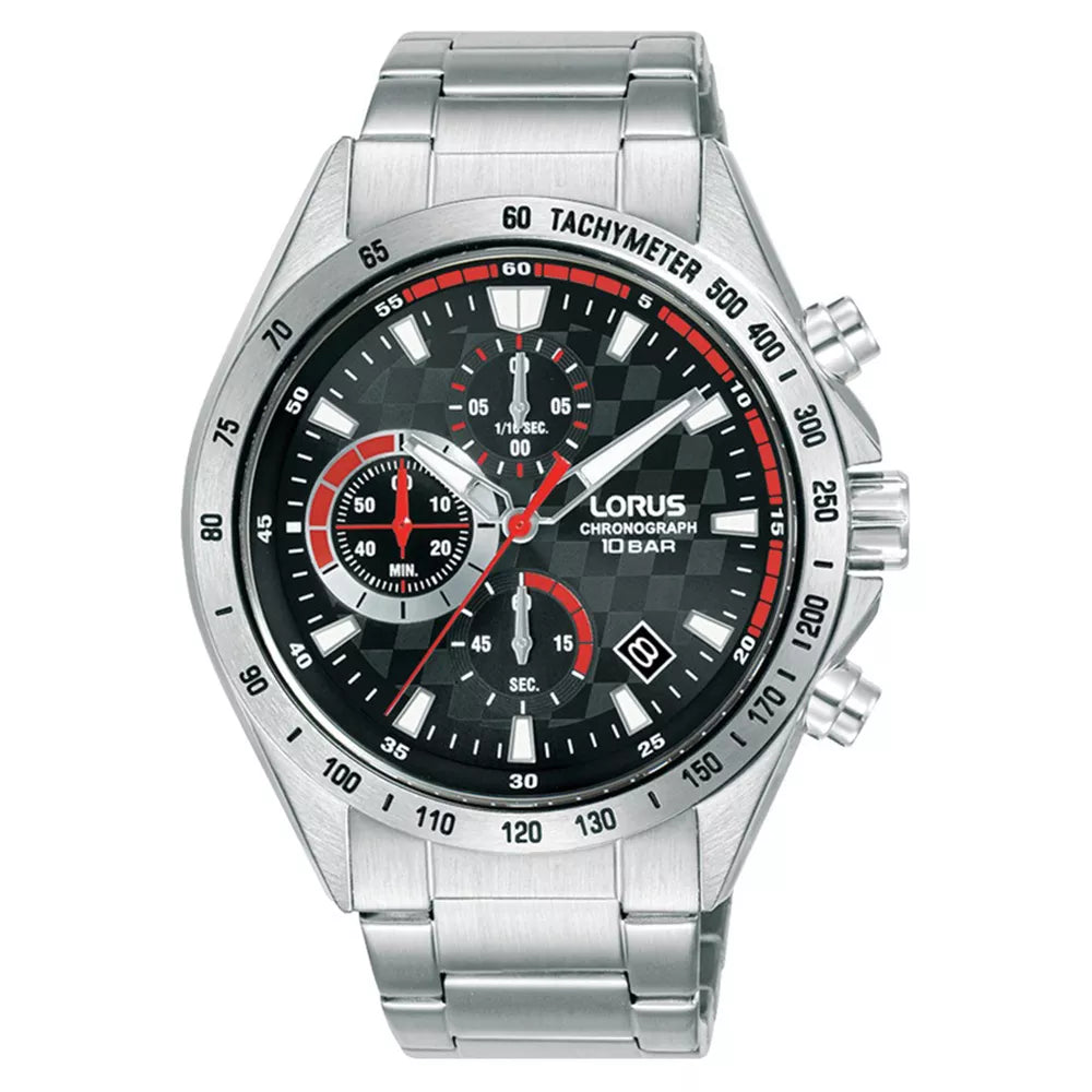 Lorus RM309JX9 je muški sat sa čeličnim kućištem prečnika oko 43,5 mm i metalnom narukvicom. Ima crni brojčanik sa hronografom, tahimetrom i prikazom datuma, a pokreće ga pouzdan kvarcni mehanizam. Mineralno staklo i vodootpornost do 100 m omogućavaju svakodnevno nošenje, uključujući pranje ruku, kišu i plivanje. Robustnog je i sportskog dizajna, idealan za aktivan stil života.