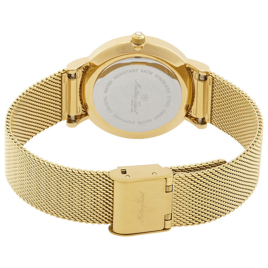 Mathey‑Tissot Electra D983SPYI je ženski švajcarski ručni sat iz kolekcije Electra, pokretan kvarcnim mehanizmom Ronda 762, u pozlaćenom kućištu od nerđajućeg čelika prečnika 32 mm i debljine oko 6 mm. Ima srebrni brojčanik sa zlatnim kazaljkama i dijamantnim markerima umesto klasičnih indeksa, fiksni bezel u zlatnom tonu i milanski (mesh) narukvicu od čelika u istom zlatnom tonu. Staklo je safirno (otporno na ogrebotine), krunica je klasična (“push/pull”), a vodootpornost iznosi 5 ATM (50 metara / oko 165 stopa), što znači da je sat otporan na prskanje, kišu i povremeno nošenje u vodi, ali nije namenjen za ronjenje.