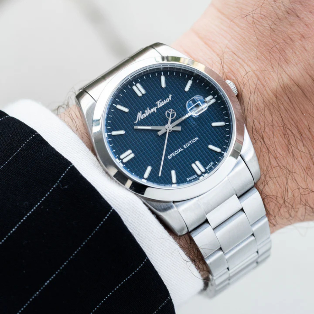 Mathey‑Tissot H452ABU je muški ručni sat koji kombinuje robustan sportski karakter sa elegantnim švajcarskim dizajnom, namenjen modernom muškarcu koji traži stil i pouzdanost. Kućište od nerđajućeg čelika u prečniku od 40 mm sadrži plavi brojčanik sa luminiscentnim kazaljkama, prikazom datuma na poziciji "3 sata" i safirno obloženim staklom za dodatnu otpornost na ogrebotine. Sat pokreće precizan švajcarski kvarcni mehanizam Ronda 505, a zahvaljujući vodootpornosti do 200 metara (20 ATM), idealan je i za plivanje ili rekreativno ronjenje. Metalna narukvica sa sigurnosnom kopčom upotpunjuje njegovu praktičnost i sofisticirani izgled.