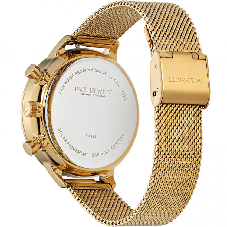 Dodajte elegantnu dimenziju svom izgledu tako što ćete nositi ovaj ženski analogni sat iz kolekcije Paul Hewitt. Beli okrugli brojčanik zaštićen je safirnim kristalom. Ima krunu za podešavanje vremena. Kaiš od nerđajućeg čelika dolazi u zlatnoj nijansi koja dodatno podiže izgled merioca vremena. Osim toga, upotpunjen je preklopnom kopčom sa skrivenom dvostrukom kopčom na dugme kako bi se osiguralo sigurno prianjanje na zglob.