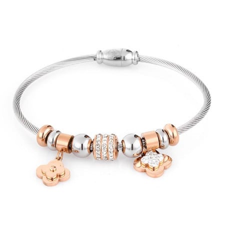 Ženska narukvica u srebrnoj boji sa privezcima. Narukvica je izradjena od nerdjajućeg čelika.
