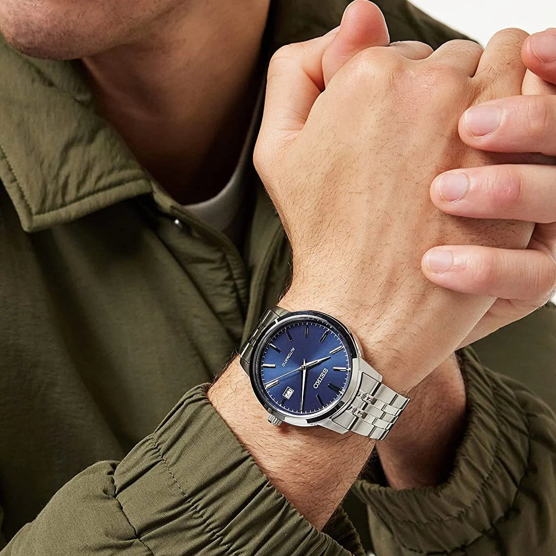 Seiko SRPH87K1 je elegantan i svestran muški automatski sat na pouzdanom mehanizmu Seiko 4R35 (23 rubina, ≈41 sat rezerve, ručno navijanje i stop-sekunda), smešten u čeličnom kućištu prečnika 41,2 mm sa Hardlex staklom i čeličnom narukvicom sa trostrukom preklopnom kopčom i sigurnosnim zatvaranjem; ističe se sunray plavim brojčanikom koji menja nijanse u zavisnosti od osvetljenja, prozirnim zadnjim poklopcem koji otkriva mehanizam, praktičnim prikazom datuma i vodootpornošću 10 bar / 100 m (pogodno za plivanje, ne za ronjenje) — klasičan, čist dizajn i kvalitetni materijali čine ga idealnim izborom za svakodnevno i poslovno nošenje, uz odličan odnos kvaliteta i cene.