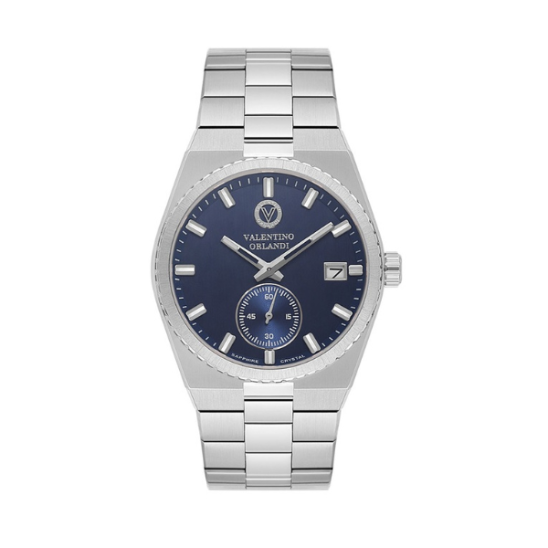 Valentino Orlandi VO.1.10006.3 je muški ručni sat sa kućištem prečnika približno 43 mm, izrađenim od nerđajućeg čelika u elegantnoj plavo-srebrnoj boji, kombinovan sa kontrastnim crnim brojčanikom. Pokreće ga precizan kvarcni (Quartz) mehanizam, a staklo je safirno i otporno na ogrebotine. Narukvica je takođe od čelika i u istoj boji kao kućište, dok vodootpornost iznosi 5 ATM – pogodna za svakodnevnu upotrebu i zaštitu od prskanja, ali ne i za plivanje. Sat uključuje prikaz datuma (kalendar), što ga čini stilskim i praktičnim izborom za poslovne i svakodnevne prilike