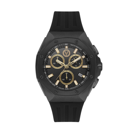 Valentino Orlandi VO.1.10015.5 je muški ručni sat sa kućištem prečnika približno 47mm, izrađenim od nerđajućeg čelika u crno-zlatnoj boji. Opremljen je silikonskom narukvicom koja prati nijansu kućišta, safirnim staklom otpornim na ogrebotine i preciznim kvarcnim mehanizmom Quartz. Sat poseduje funkcije hronografa (kronometra) i prikaz datuma, a vodootpornost iznosi 10 ATM, što ga čini pogodnim i za plivanje. Moderan i robusan dizajn čini ovaj model idealnim za poslovne i aktivne prilike.